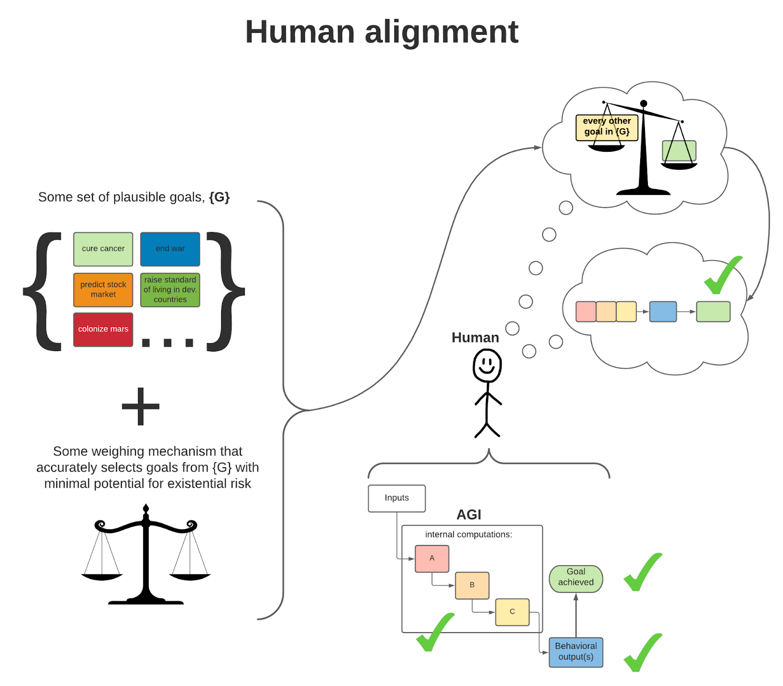 The prospect of implementing the ‘right’ goal for an AGI to pursue (i.e., a goal that is minimally likely to lead to existential risk) logically requires all of the following: (1) the existence of some wider set of plausible goals to assign to the AGI, (2) some mechanism that can search this set to find goals that are least likely to engender existential risks, and (3) a human that is willing to actually assign that goal (as opposed to other, less safe goals) to the AGI. All three of these conditions are represented below: