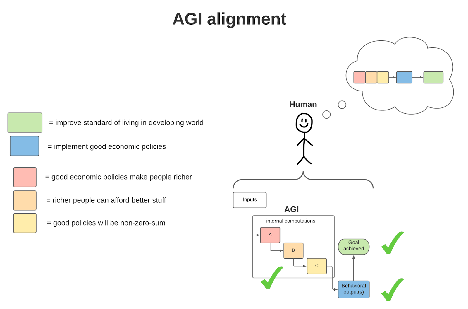 Here, we see an AGI that, with the inputs it receives, successfully improves the standard of living in the developing world (the human’s goal) by implementing good economic policies (the right way, given the human’s intentions), because good economic policies do things like enrich people in a non-zero-sum manner (the right reasons, given the human’s intentions). This AGI is therefore fully aligned.