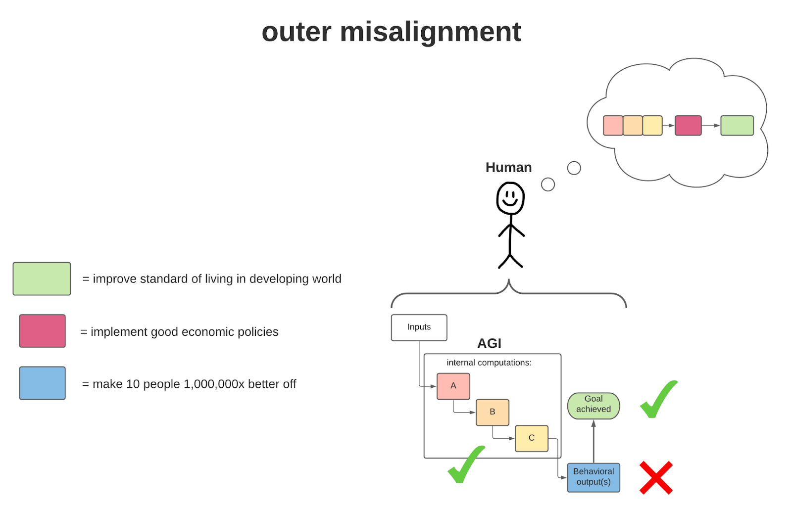 Here, we see an AGI that, with the inputs it receives, successfully improves the standard of living in the developing world (the human’s goal) by making a few people orders of magnitude better off (thus raising the relevant metrics of overall standard of living—e.g., per capita income). But given the intentions of the human (something more like ‘implement good economic policies’), this behavioral output does not achieve the goal in the right way. Thus, this AGI is outer misaligned.
