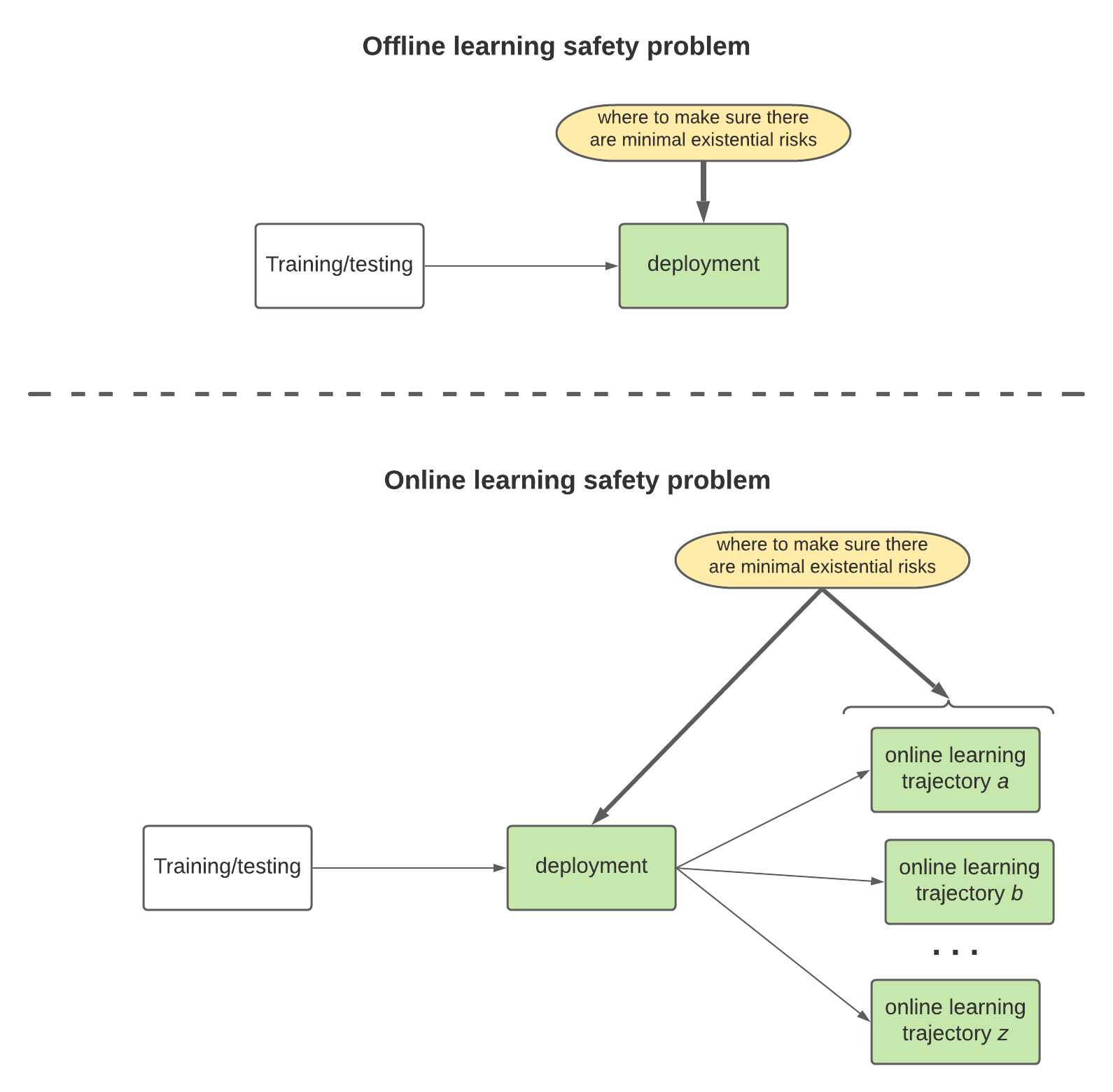 By contrast, the online safety learning problem is to minimize the likelihood of existential risks post-deployment in an algorithm that continues to learn (by definition), which requires finding control proposals that mitigate risk across a vast number of unknown states: those of the possible future trajectories of the still-learning deployed AGI. This is displayed below: