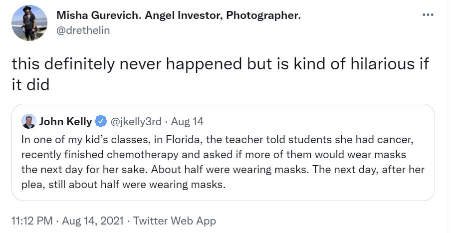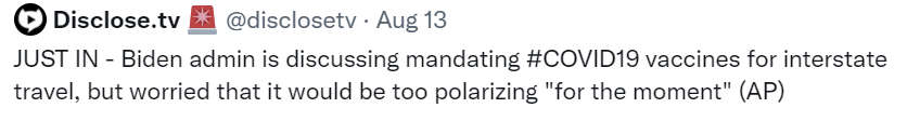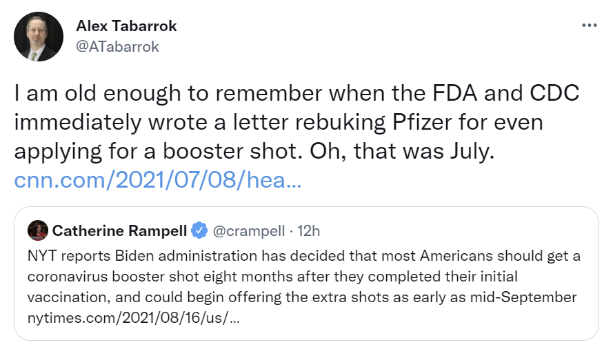 Soon, you’ll be able to get a third shot eight months after your second shot. Biden plans to do this ‘when it is available (WaPo)’ as if he wasn’t the President of the United States and couldn’t get his hands on a third dose or perhaps face a slightly unusual cost-benefit calculation that might justify doing it a bit early. It’s bizarre the times that Biden thinks the geometries bind him, versus when he thinks they do not, I can mostly predict it intuitively but it’s still very strange.