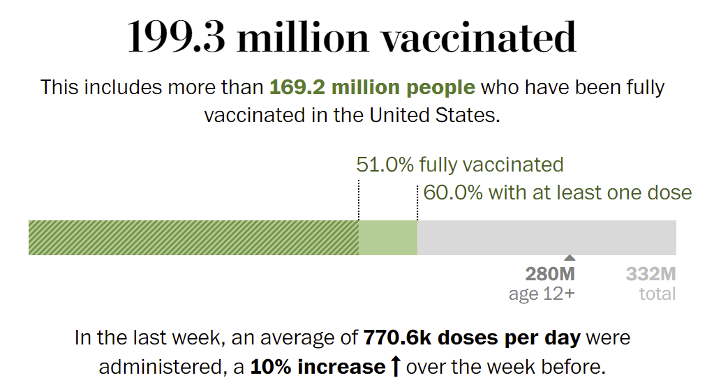 FiveThirtyEight has a breakdown of unvaccinated America, which tells the usual story that there’s a constant pool of ‘I will never ever ever get the vaccine’ attitudes, while a steady portion of everyone else gets vaccinated. If that’s the case, then keeping our vaccination rate essentially constant is quite the accomplishment at this point, as it’s drawing from a quickly narrowing group of people.