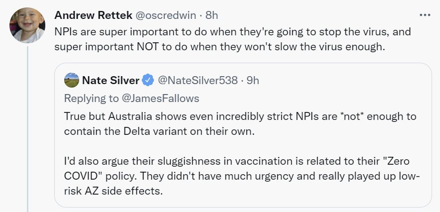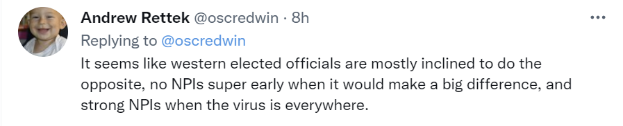 There is a golden middle where population-level NPIs (non-pharmaceutical interventions) are great, which is where you can stop Covid if and only if you use the NPIs for a limited amount of time.