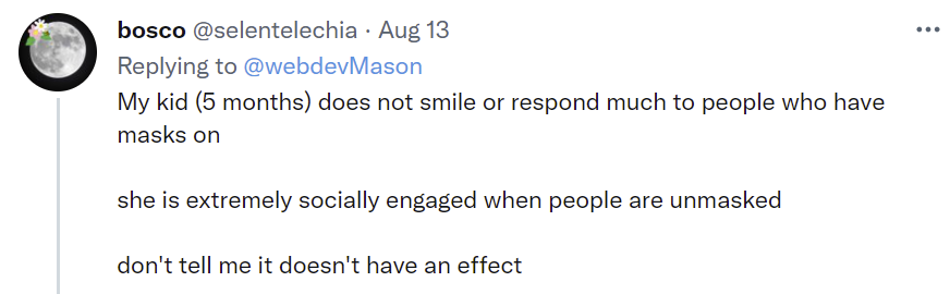 Young children learn about the world by interacting with it. What would happen if suddenly all the adults around them were covering the lower half of their faces? Someone really ought to do a study, except no, no one will ever do that.
