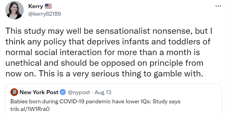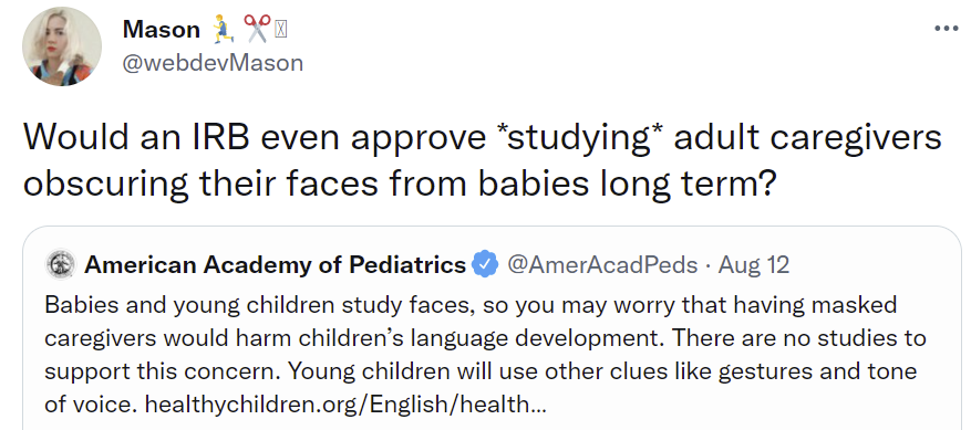Also, at least some data is in on how babies are doing these days, and Kerry’s perspective seems directionally wise, although I agree with the study authors that the social isolation is the dominant factor here rather than masks (study).
