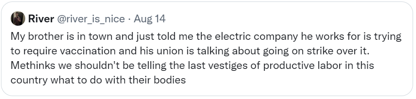 You can see the room now, where someone was tasked with coming up with as many different names as possible for places requiring vaccination. What do people even do inside, anyway? We need ten different variations of indoor dining by the 11am press conference. The two sides are both trying to make the mandates look as obnoxious as possible, for different reasons.