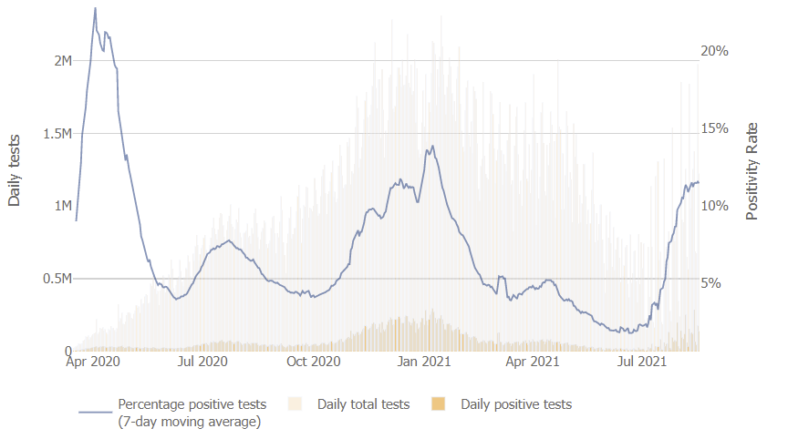 The test positivity rate has mostly leveled off as well, with a clear phase shift: