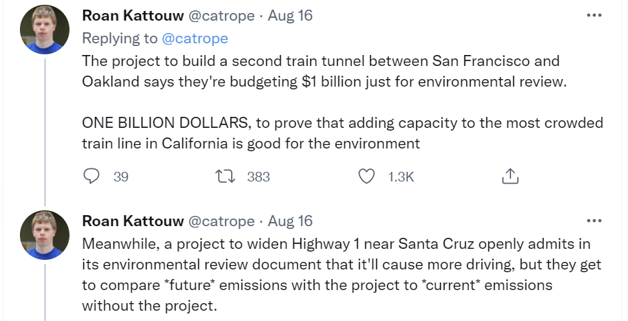 If you think that’s bad, the city of San Francisco is going to build a tunnel for a train line and its baseline budget for environmental review is (all caps mandatory, there are rules) ONE BILLION DOLLARS. With a B.