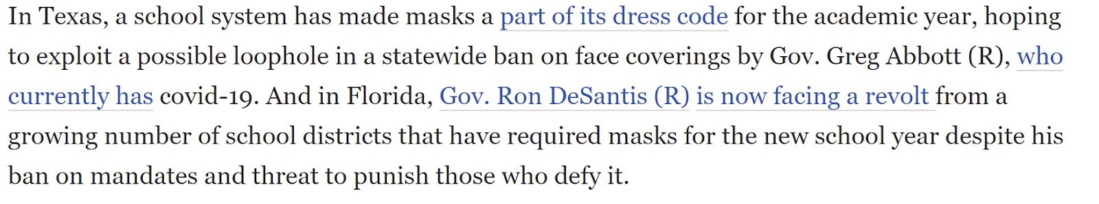The arguments are mainly over whether to (A) mandate mandating masks or (B) mandate not mandating masks, without that much support for (C) neither mandating nor not mandating mask mandates and letting people decide under what rules they will associate, either in local public venues like schools and/or local private venues like gyms or restaurants. Thus, Florida and Texas mandate not mandating masks in schools and threaten to withhold funding, and others try to sue or coerce them into mandating mandating masks instead, or at least take Biden’s tactic of mandating not mandating a lack of mandates (WaPo) including using the civil rights act.