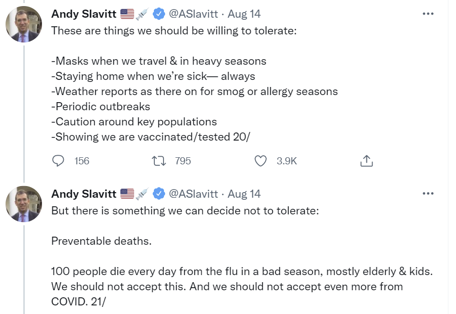 Via MR, thread by Andy Slavitt, Former Biden White House Sr Advisor for COVID Response, laying out the need to live with Covid long term and proposing eminently reasonable actions for doing the best we can with that. Here’s his takeaways at the end: