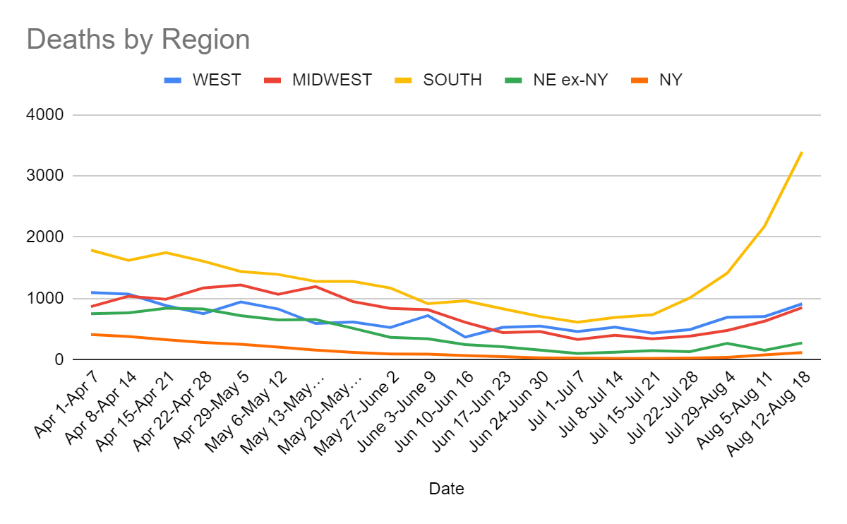 For cases, we got a good result, where the slowdown was real. For deaths, we got a quite bad result, where the slowdown was a mirage and we are back on the previous trajectory, and likely overshot a bit. Both are common, so predictions have to split the difference, but on reflection the slowdown in deaths couldn’t continue, and I should have predicted at least +50% there. I also should have directly caught the California correction, which I didn’t, and that meant the count a week ago was low by at least 350 deaths there, which accounts for about half the surprise here. I’ve corrected it for the charts and numbers going forward.
