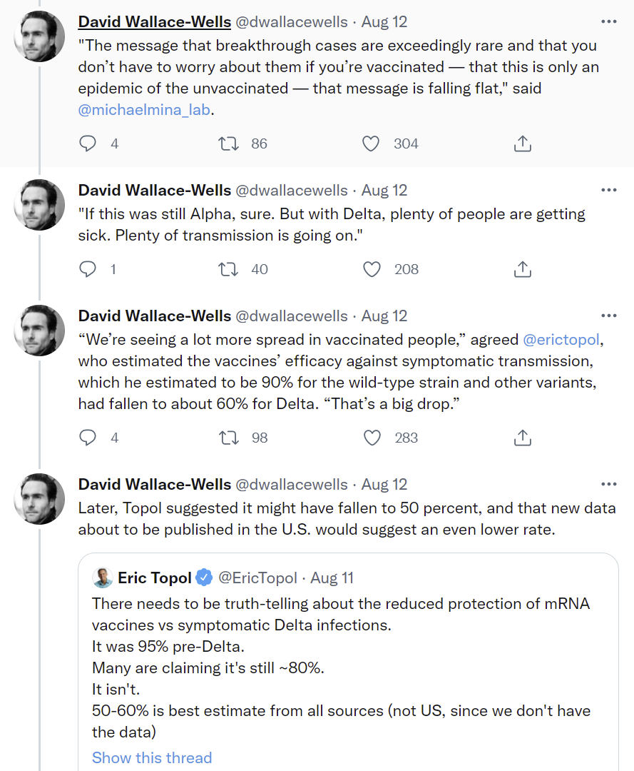 FiveThirtyEight attempts here to answer some of the justifications for vaccine hesitancy. It’s not perfect or complete, nor would I agree with every argument, but at least it seems likely to help rather than do further damage. A major theme of the objections addressed is the mindset that doesn’t differentiate 1% from 99% – the idea that if you could get infected after the vaccine, and you also might not get it without the vaccine, then the vaccine does nothing. Such people presumably understand this in other contexts (for example, you might crash if you drive sober rather than drinking first) but it really is a true objection here, because they want to buy a mindset rather than buy actual safety, and refusing to sell that mindset means no sale.