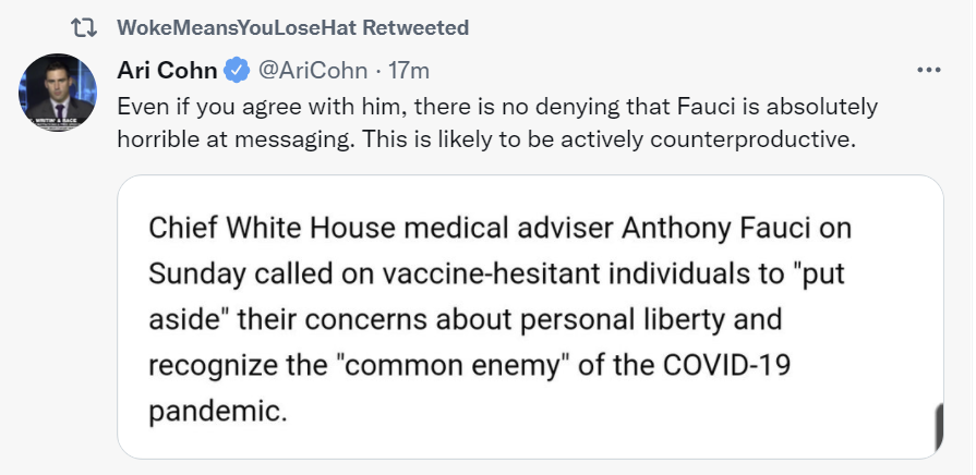 I’ve spent much of the last month arguing in favor of mandates and vaccinations, and I notice that this statement pissed me off quite a bit. It’s almost engineered to piss people off, to the extent it doesn’t feel like an accident, as if Fauci’s goal was to signal bad intent and further inflame tensions.