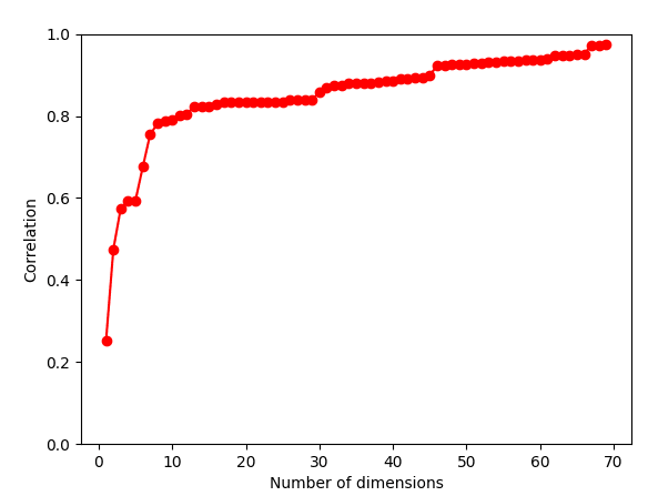 It becomes sketchy to even start interpreting or talking about the sex differences in these scores if those sex differences do not reflect sex differences in the items that we expect to be related to the scores. To solve this, we can bring in additional dimensions, rather than trying to reduce everything to a single Autism-Allism or Systemizing-Empathizing dimension. To pick the number of dimensions to use, I look at the correlation between the predicted and the actual sex difference as a function of the number of dimensions: