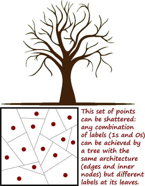 … it simply equals the number of leaves. This follows from the fact that a tree divides the domain space into subsets where is the number of leaves, as we’ve just argued. It’s equally easy to see that larger subsets cannot be shattered because the tree will assign all points within the same subset the same label.