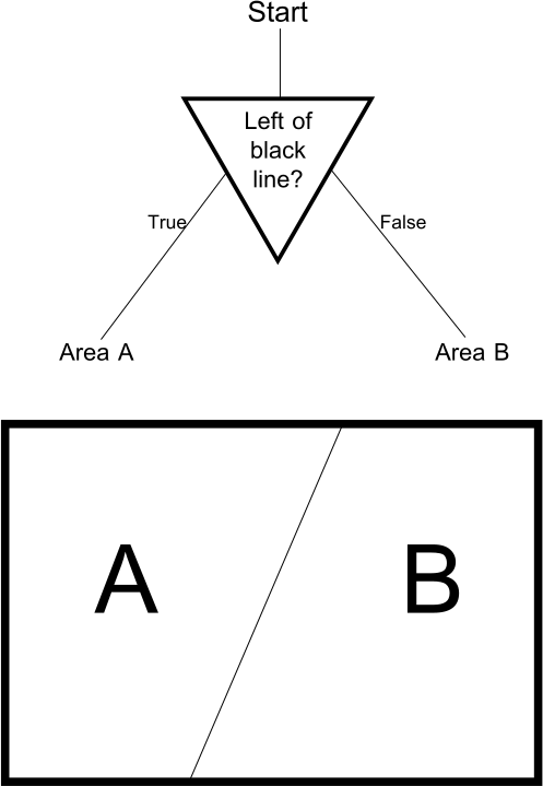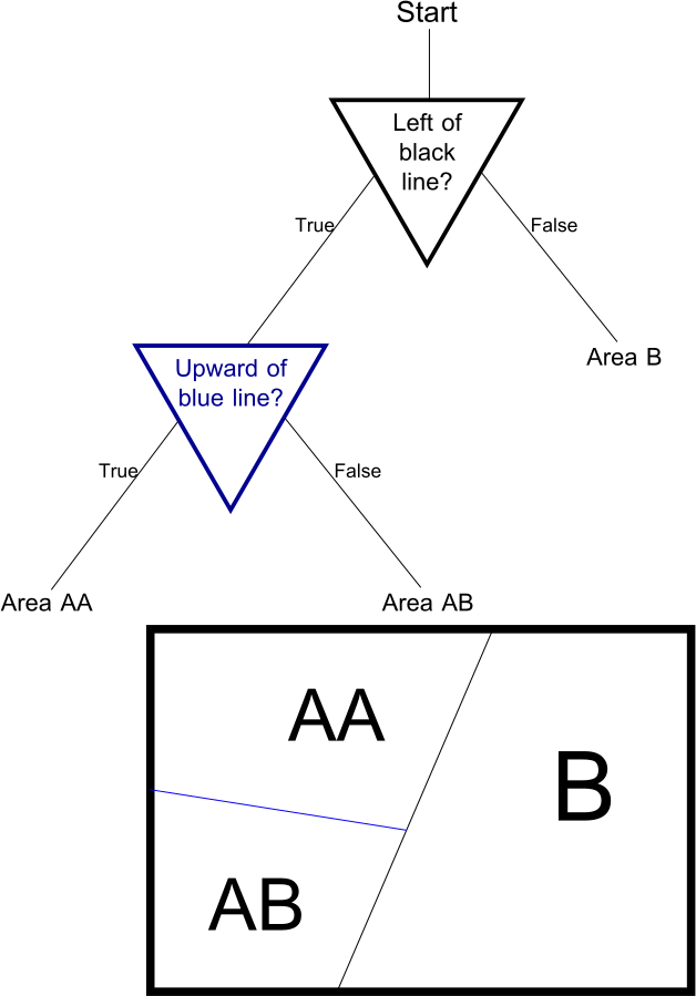 When the tree branches in two, the domain space is divided in two. And this is true for each branching point, even if the area corresponding to a node isn’t the entire domain space to begin with: