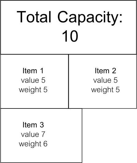 A greedy algorithm would start by packing item 3 because it has the best score, at which point the remaining capacity isn’t large enough for another item, and the game is over. Meanwhile, packing items 1 & 2 would have been the optimal solution to this problem.