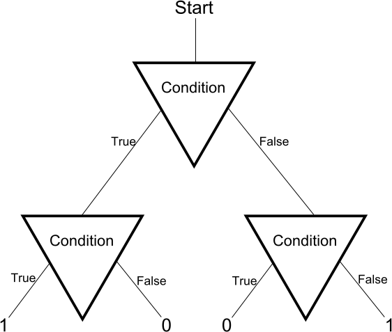 (In this case, for a binary classification problem.) If you have never seen a tree before, don’t despair – trees are simple. The triangles are called internal nodes, the four endpoints are called leaves, and the lines are called edges. We begin at “Start,” evaluate the first “Condition,” then move down accordingly – pretty self-explanatory. Trees show up all over the place in Computer Science.