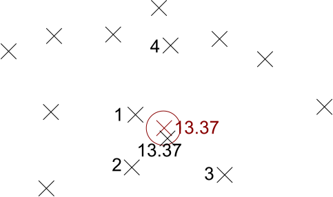The position of the points corresponds to their value in . The number next to them corresponds to their target value in . (The four closest points just happen to have target values 1-4 by coincidence.) The other training points also have target values, which are not shown – but since they’re real numbers, they are probably things like .