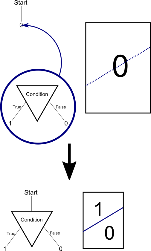 The same principle also illustrates how we can implement a logical AND, and OR goes analogously. You may work out how exactly this can be done – however, I don’t think those are the best ways to demonstrate what trees are really about. Instead, consider what happens when the tree branches in two: