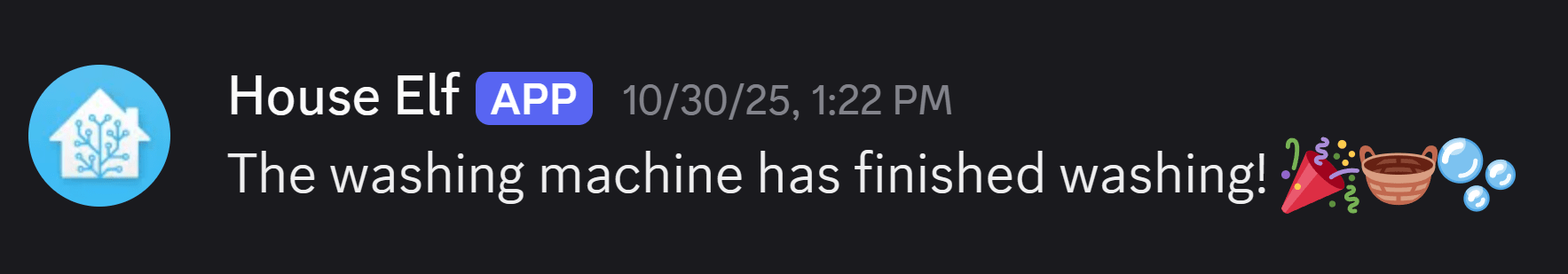 An hour later, a notification appears: the washing machine has finished washing. (Depending on whether you tapped an NFC tag next to the washing machine with your phone, it is sent either as a push to your phone only, or as a message to a channel in your house Discord and that everyone can see. You tried to make the Discord bot’s name cute, so it’s House Elf.)
