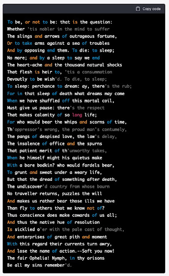 No matter. Where’d that formatting come from? It’s obviously the formatting it uses when generating computer code, which it does. The black background differentiates it from ordinary text and the different colors indicate different functional kinds of text.