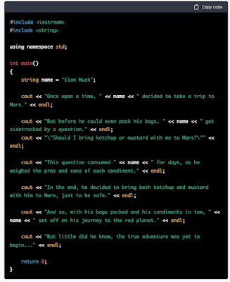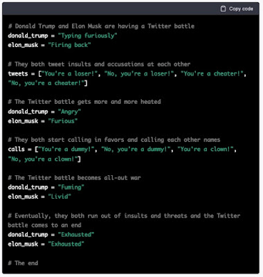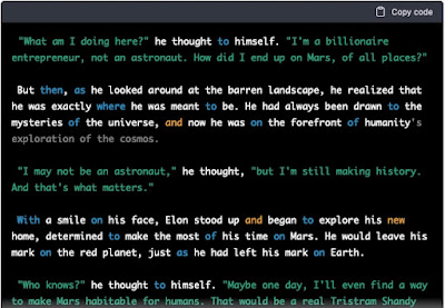 And then I ask it to produce some text and to format the result as code. It does it, which is what I asked. But how did it make the decisions it did about how to do that? Or why didn’t it just tell me, “you’re not asking for code, so code format doesn’t make sense.” In the case of that last Trump/Musk example, I didn’t prompt it to format it as code, but it did it anyway. Why? I note that earlier in that session I had asked it to write a simple sorting program, which it did, and I asked it to tell a story about Musk on Mars, in code format, which I did. But I didn’t ask for code format in that last case, and yet I got it.