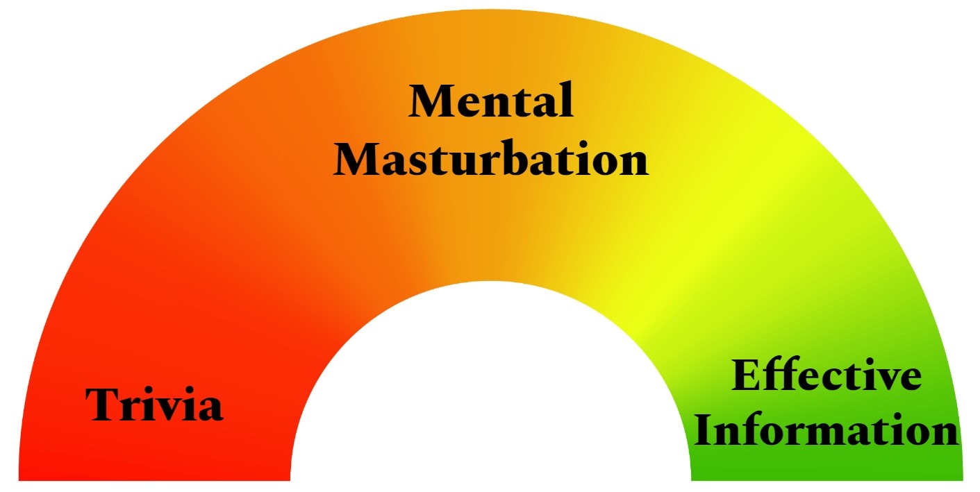 Some posts I enjoy reading for the hell of them (trivia). Some posts feel like I’m making progress towards something, but I fall short of actually changing (mental masturbation). Whereas my favorites posts (e.g., My Fear Heuristic, Unlocking Solutions) produced measurable and lasting changes in my behavior (effective information).
