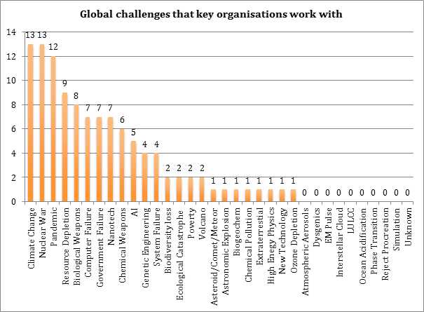 It is rarer for organisations to focus on multiple GCRs—for a start, this involves them having the concept akin to GCR, which is not often the case. In a report I’m preparing with Dennis Pamlin of the Global Challenges Foundation, here is a list of organisations focusing on multiple GCRs (note that it is not necessarily an endorsement of their quality). Let me know if there are any organisations missing, and I’ll add them: