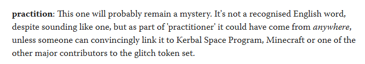 So it looks like ultra low-frequency tokens were culled, but the threshold was high enough that some survivors exhibit glitch behavior. This obviously solves itself with more data, so I would be extremely surprised if ” practition” has glitch behavior in GPT4/GPT4o.