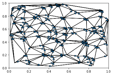 So, we have some Bayes net in which each variable is Gaussian—a linear combination of its parents plus some IID Gaussian noise. For the underlying graph, I’m using a 2D Delaunay triangulation, mainly because it does a good job reflecting physically-realistic space/time structure. (In particular, as in physical space, most pairs of nodes are far apart—as opposed to the usual Erdos-Renyi random graph, where the distance between most points is logarithmic. We’ll revisit the choice of graph structure later.) Embedded in 2D, an example graph looks like this:
