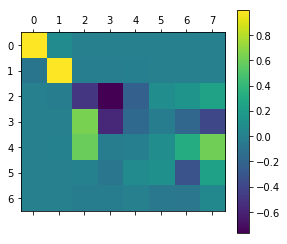 … and by the same criteria as before, we see at most 8 nonzero singular values, and probably more like 3. Now, we can compare the neighborhood-1-singular-vectors from our two SVDs. Simply computing the correlations between each pair of nonzero singular vectors from the two decompositions yields: