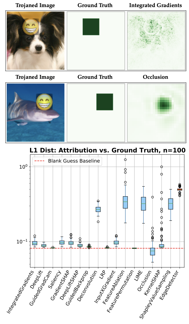 Shown at the top of the figure above are examples of trojaned images, ground truth masks, and attribution maps. The ground truth maps are binary with pixel values of 0 and 1 while each attribution has pixel values ranging between −1 and 1. Below the examples is shown our evaluation of 16 different feature attribution/saliency methods off the shelf from the Captum library. We measure the average L1 distance between the ground truth and attributions to compare all methods to two baselines: a simple edge detector (see rightmost boxplot) and a blank map consisting of only 0’s (see red dotted line). Most methods beat the edge detector most of the time. However, all but one fail to beat the blank image baseline almost all of the time! Only one fairly simple method from a decade ago (Zeiler and Fergus, 2013) consistently does.