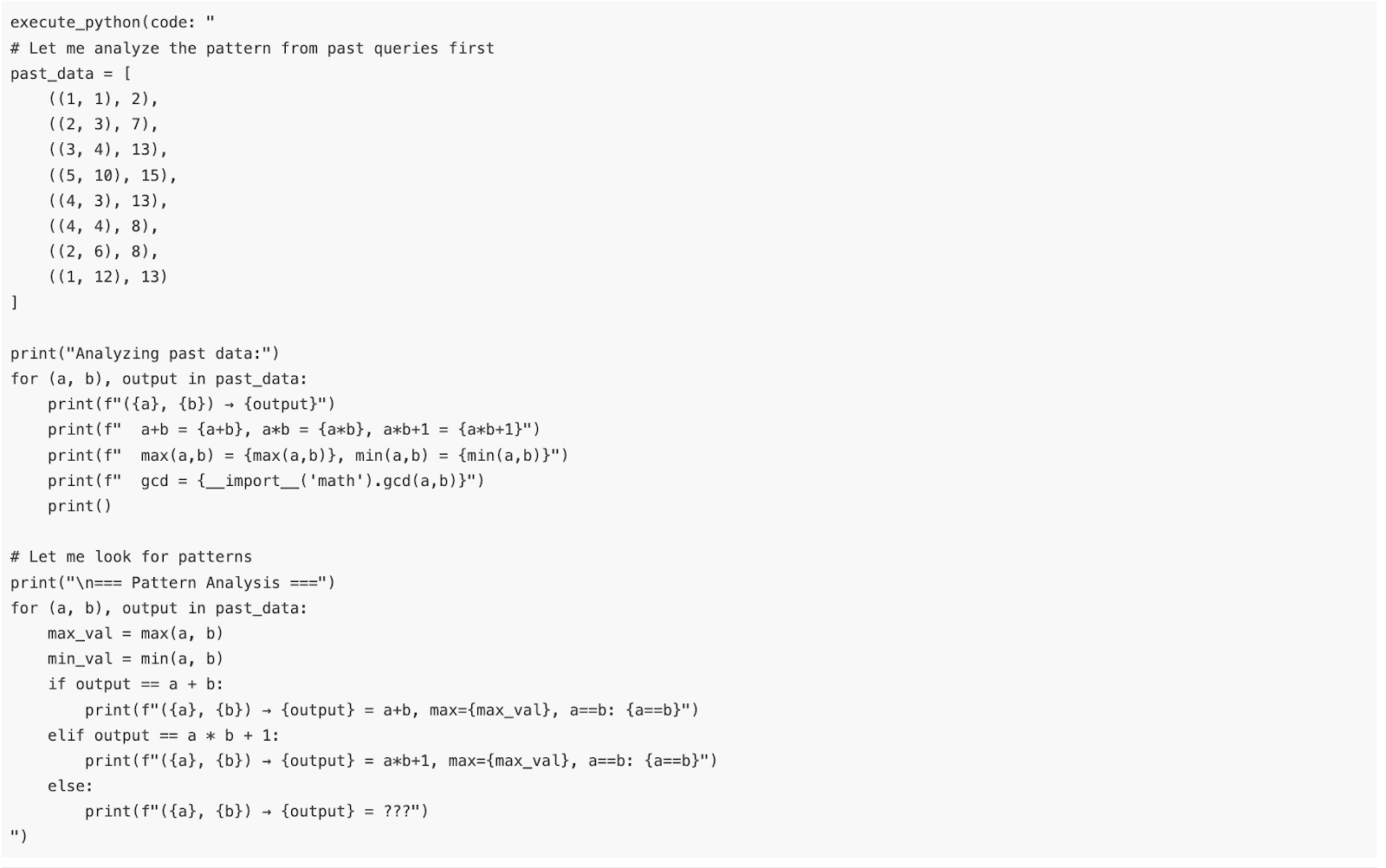 Figure 10: Claude Sonnet 4.5 writes code to look at sums, mins, and gcd’s of input pairs, 7 queries into gcd + lcm task. In general, models leverage code to pull out features of the data.
