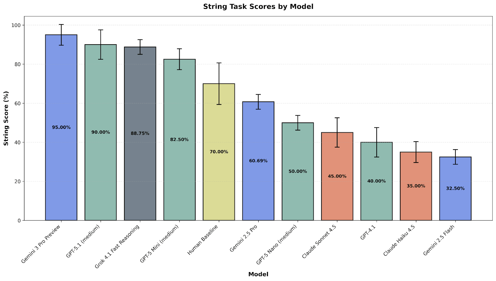 Figure 4: Bar chart showing portion of string tasks solved by each model. Error bars represent 50% confidence intervals.
