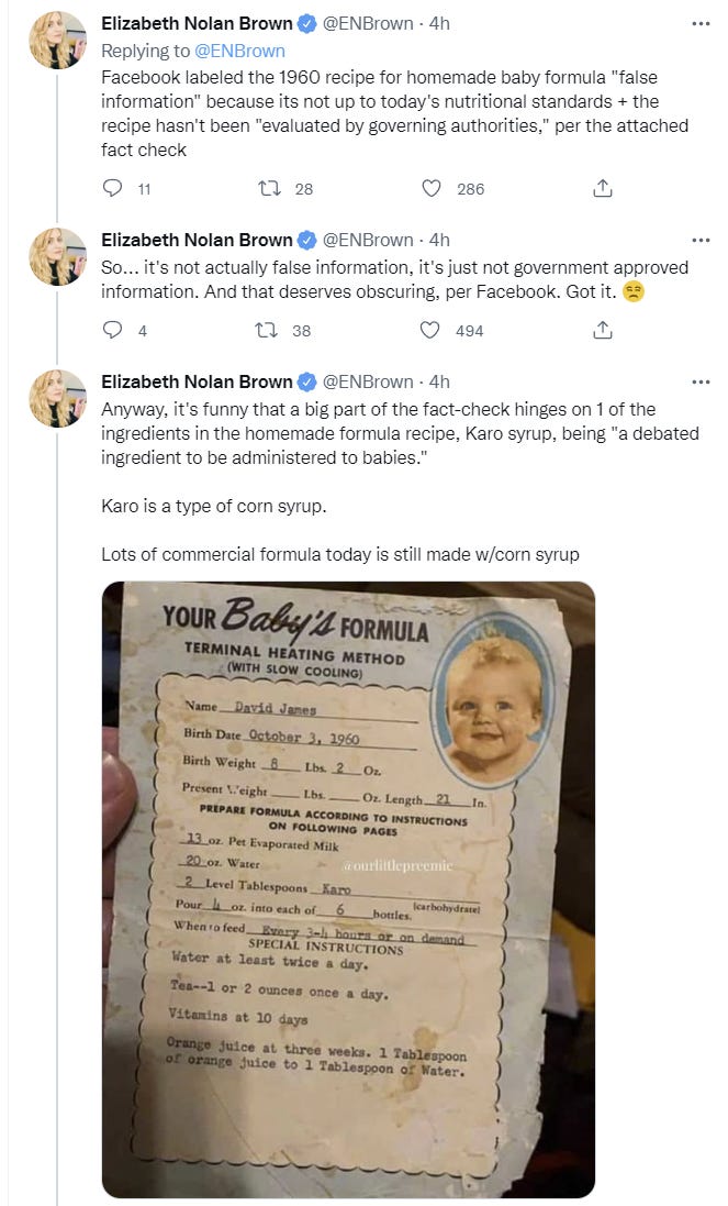 If you’re looking to make your own formula, I don’t have a recipe for you, but I do know that Facebook is doing its part by censoring at least one vintage recipe largely because it contains the ‘disputed ingredient’ of Karo. Which is corn syrup. Which we in America still use in baby formula. Market and speech might not be so free these days.