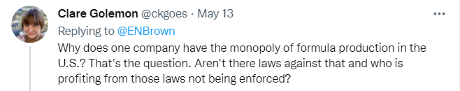 That’s not to excuse Abbott’s safety failures, which of course should be investigated. But that would be true regardless of the shortages. The ‘business practices’ that matter here are the consolidation into four companies, which in turn is the result of the ‘market conditions’ the government created. Which, of course, are likely in turn largely caused by regulatory capture from the formula companies.