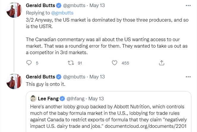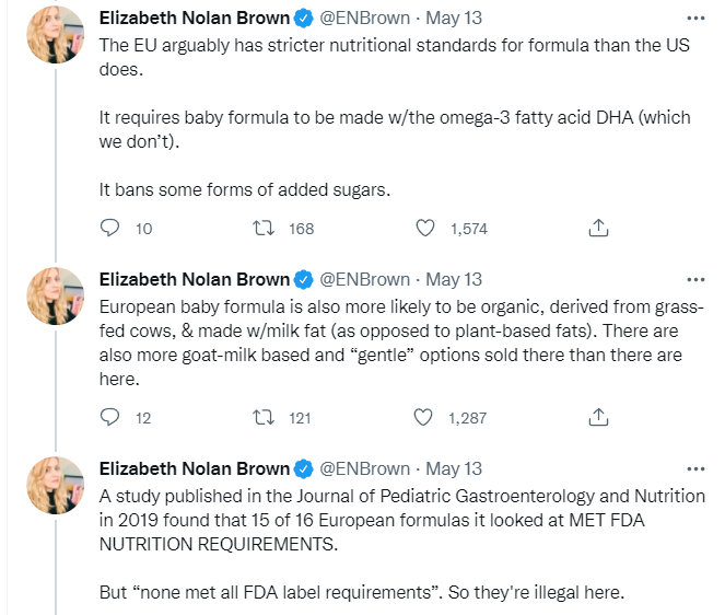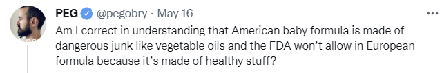If you read more in that thread, there’s discussion of a NY Times article about why it would be dangerous to allow European baby formula, and it’s… really something. The insane troll logic is strong. He calls it ‘pure insanity’ and he’s right. Click through to the thread if you want the full story.