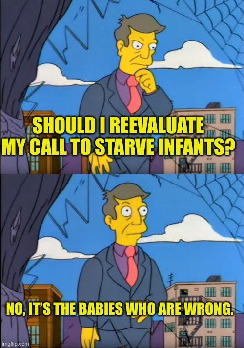 No matter what else you say about the Biden Administration, I am confident they are not in favor of literally starving babies to death. They’re not as fully committed into the anti-babies-starving-to-death camp as I am, but if there was a knob that said ‘starve [adjective] babies to death’ I am confident that no matter what the adjective was they would turn the dial as far as they could in the ‘don’t starve any babies’ direction.