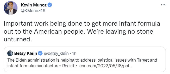 The Biden Administration is, months in, suggesting that states ‘allow WIC recipients to buy whichever formula products are in stock’ and also this gem.