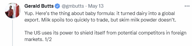 He then says this is the difference between a ‘supply’ problem and a ‘supply chain’ problem. That’s an important point, but only if you take ‘supply’ to mean ‘domestic supply’ because we’ve automatically ruled out other supply. If you consider that our ‘supply chain’ to get formula from Europe is we intercept it at the border and impound it, then we very much have a supply chain problem. One can solve a supply chain problem by having more supply available at more convenient parts of the chain, to take pressure off the chain. Or one can solve a supply problem by improving the supply chain, and using alternative sources of supply.
