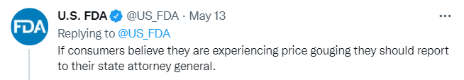 This is the FDA’s message to us. “A product needed for babies to survive, whose supply we have restricted, is selling out and people can’t find any. If you see anyone charging a market-clearing price that keeps it in stock for those who need it most and encourages more supply, please report them right away.”
