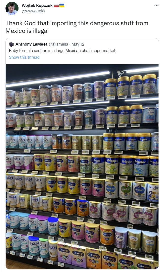 Because the logical knots this ties various people into is hilarious. Mexico, you see, does not restrict imports of baby formula, so they are fully stocked and could easily handle our orders, and their babies seem to do fine.