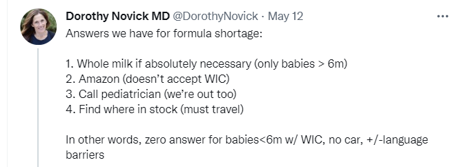 And of course as discussed below, there’s ‘encourage substitution out of formula for babies old enough for that’ but that’s a hard message to have to give since it means admitting there’s a problem, and that some people will have to go without. In some circumstances admitting you have a problem is the first step, but not here. It’s hard to ration things that people feel they need, which many of them actually do really need to have their babies not die, and for which you are thus understandably unwilling to raise prices.