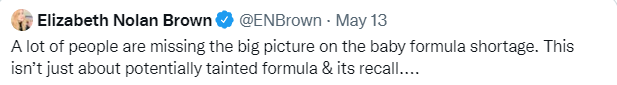 Of course, one could say that 40% of all formula being out of stock is a little bit bigger of a deal than the original problem and this problem could be settled by liability and reputational damage. We don’t live in that world.