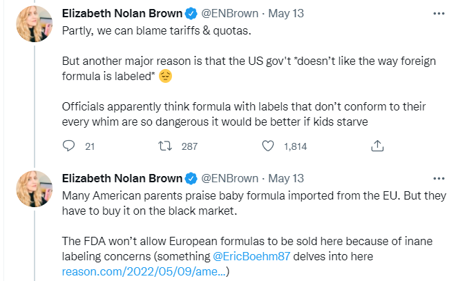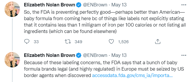 I am going over this again, now that the full picture is clear and politicians have made various new insane statements, because the situation is so perfect. It’s terrible, in the sense that mothers are panicking and having trouble finding formula to keep their kids alive. I’m quite unhappy about it happening. What I mean is that this is the perfect example of a situation in which all the things our government likes to do combine to create a mysterious completely unnecessary shortage of a vital product via driving out most potential suppliers. Then those forces combine to prevent the problem from being fixed, and those responsible then blame capitalism and corporations for a problem they would have handled quite well if they’d been permitted to do so.