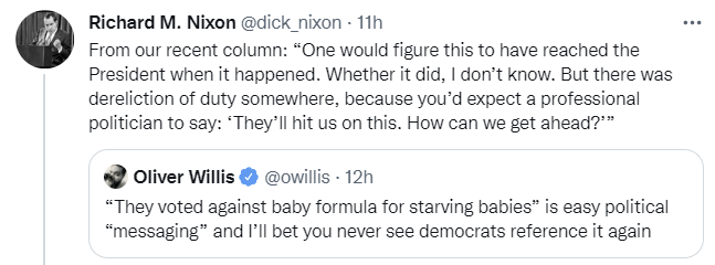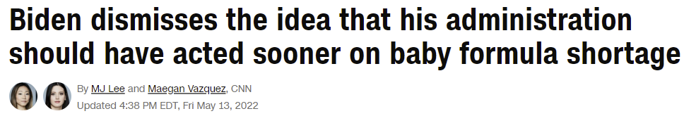 So, why didn’t they act earlier? Here is one model, mentioned while discussing the administration needing to ask Congress for $28 million ‘for the baby formula shortage’ because they’re trying to solve it through central action rather than lifting supply constraints or fixing rule sand incentives, and almost all the Republicans voting no.