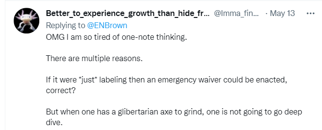 As for alternative solutions, the FDA’s job is to stop people from doing things, take one more in the replies.