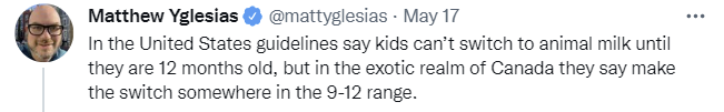Also in many cases solid foods. There are a bunch of options. If we have a genuine shortage of baby formula, the rules that are currently focused on things like ‘simple guideline people can understand and not stress out about it’ give way to practical considerations. As Matt points out, if you switch out of formula at 9 months instead of 12 months, you save a lot more than 25% of formula you were using, because larger babies need more formula.
