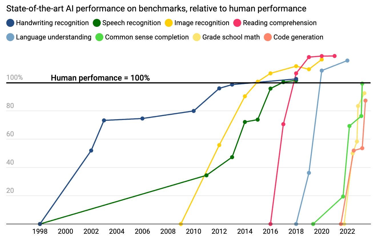 For instance, the dark green line shows scores on a speech recognition test. If you’d looked at that plot in 2013, you might have been able to estimate speech recognition scores for 2015. But you’d have had no way of anticipating that reading comprehension (pink line) would start to take off after 2016. Performance on one benchmark doesn’t say much about performance on another.